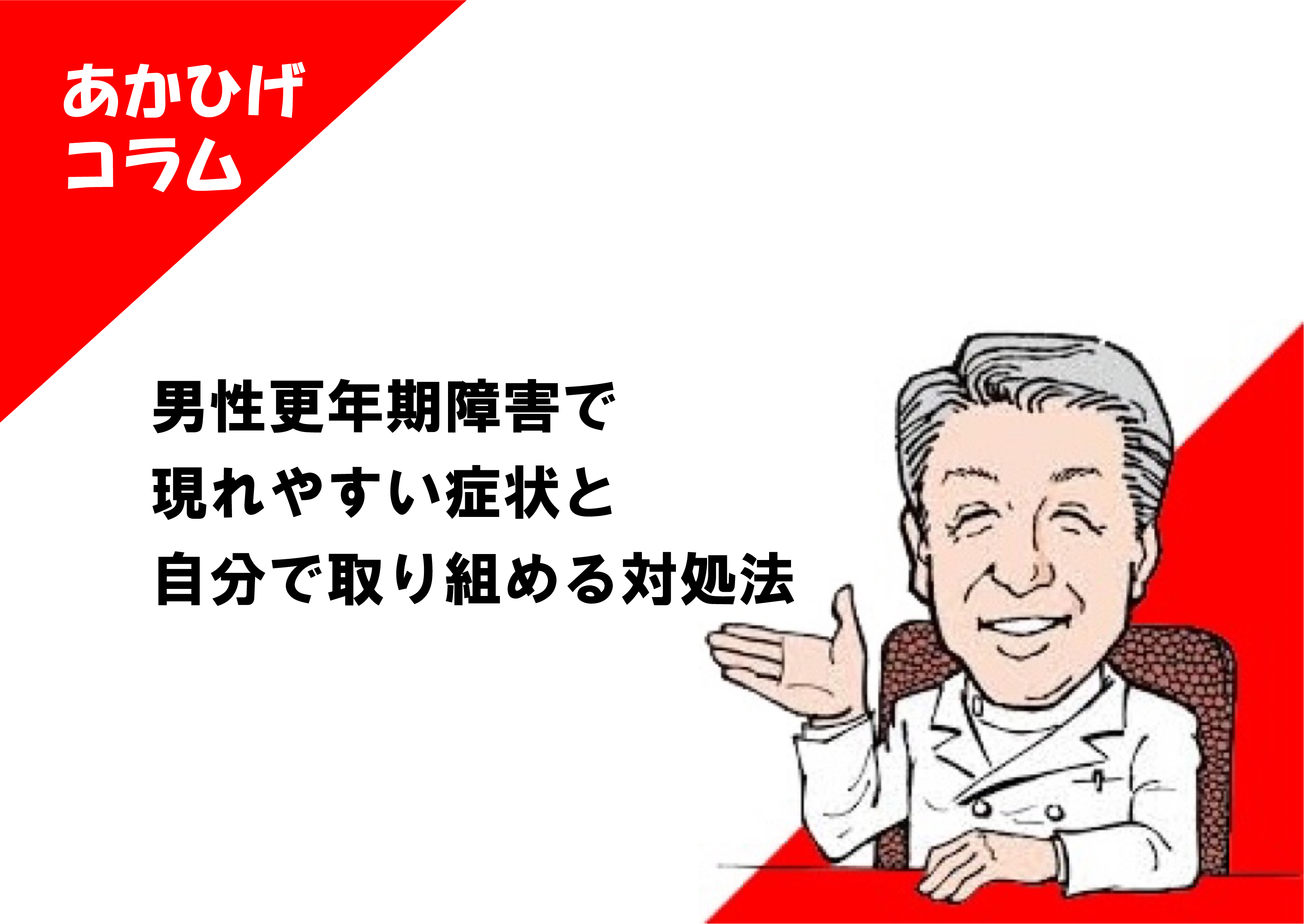 男性更年期障害について詳しく解説しました。加齢とともに男性ホルモンは低下するため、誰でも悩まされる恐れがあります。身体的な不調・精神的な不調・性的な不調を感じている方は注意が必要です。セルフケアを試したい場合は、精力剤専門の薬局として35年以上の歴史がある「あかひげ薬局」にご相談ください。お困りごとをおうかがいしたうえで、専門知識に基づくご提案をさせていただきます。