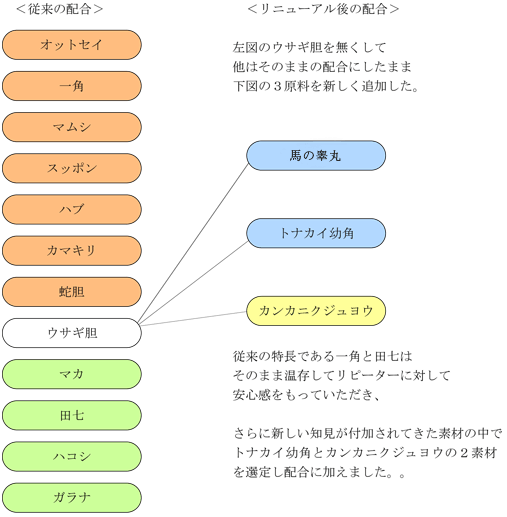 新しい知見が付加されてきた素材の中で トナカイ幼角とカンカニクジュヨウの2素材を選定し配合に加えました。いずれも高級原料で高価な代物です。